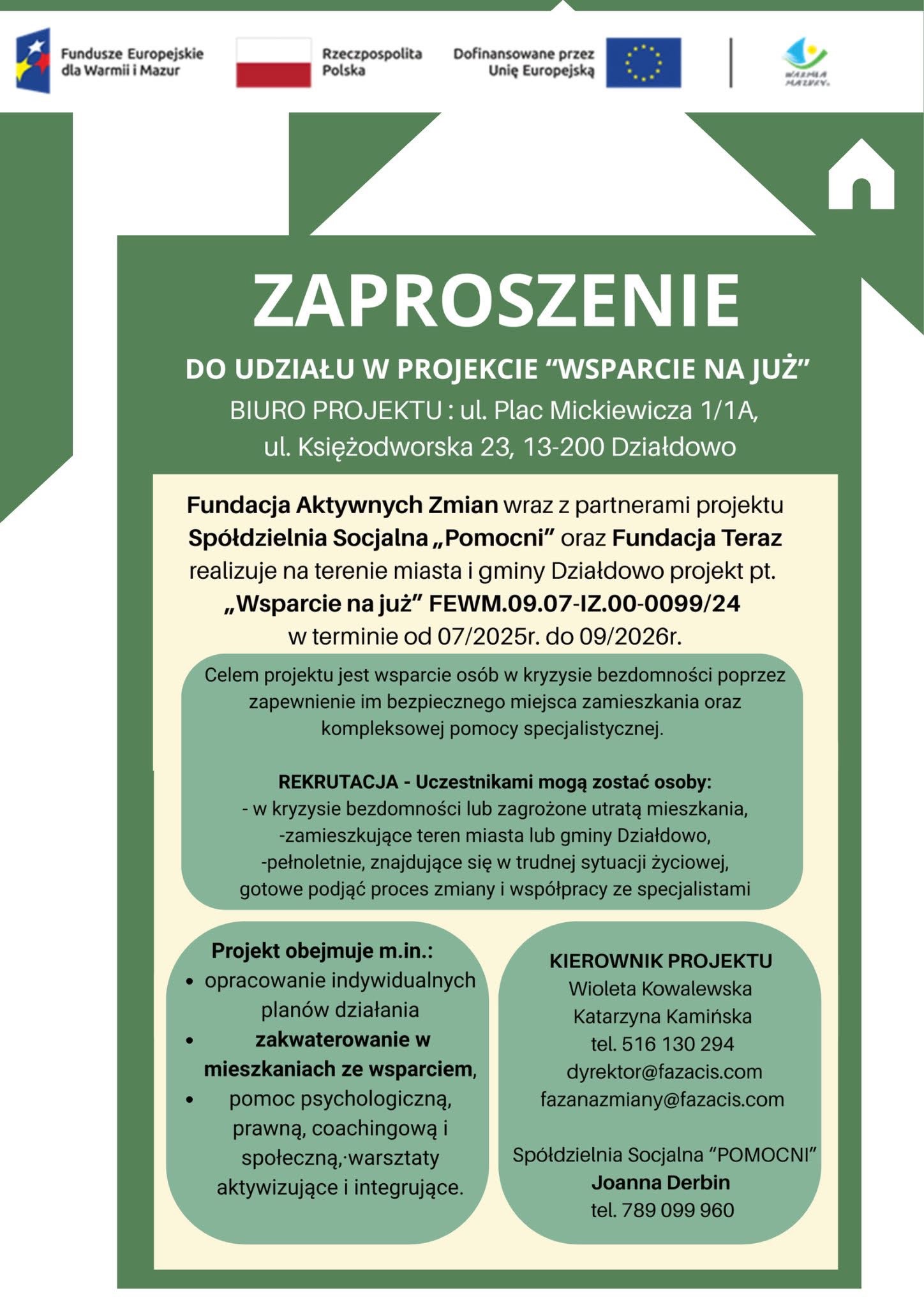 Fundacja Aktywnych Zmian realizuje projekt „Wsparcie na już”, współfinansowany ze środków Funduszy Europejskich dla Warmii i Mazur 2021–2027 w ramach Europejskiego Funduszu Społecznego Plus (EFS+), Priorytet 9 – Włączenie i integracja społeczna, Działanie 9.7.